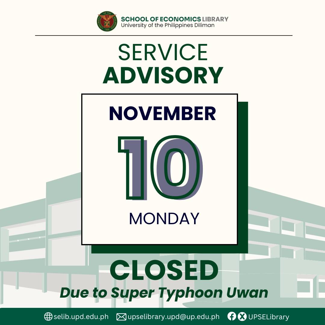 Service Advisory (Typhoon Uwan) UPSE LIBRARY SERVICE ADVISORY In line with the work and class suspensions due to Super Typhoon "Uwan," the UP School of...